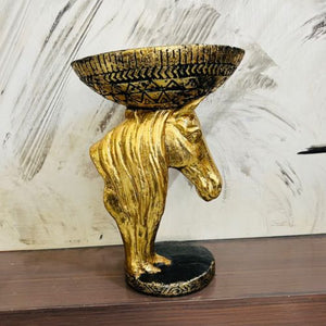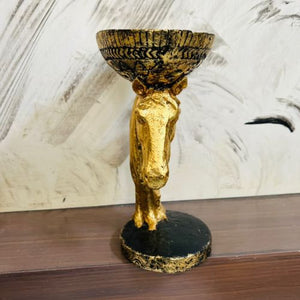 Standing 10 inches tall and 5 inches wide, this handcrafted golden masterpiece features a beautifully sculpted horse head supporting an intricately patterned bowl — a true expression of artistic luxury.