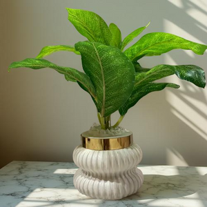Crafted to strike the perfect balance between nature and luxury, the Verde Luxe Planter offers an elegant and calming visual presence. The lifelike green foliage adds freshness to any corner, while the uniquely sculpted planter base—with its soft curves and glossy gold rim—adds a touch of modern opulence.